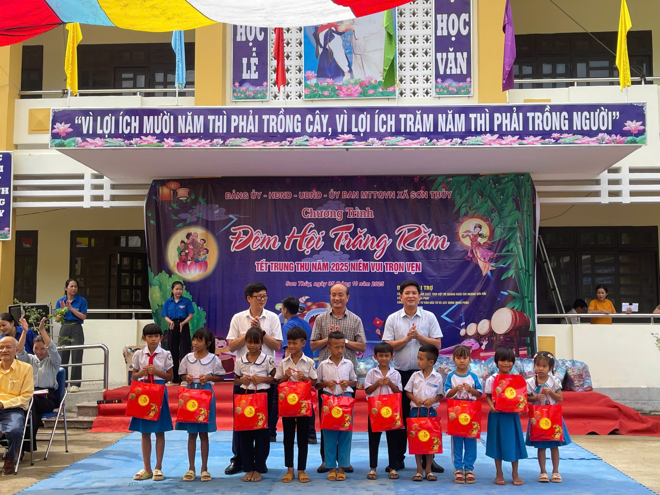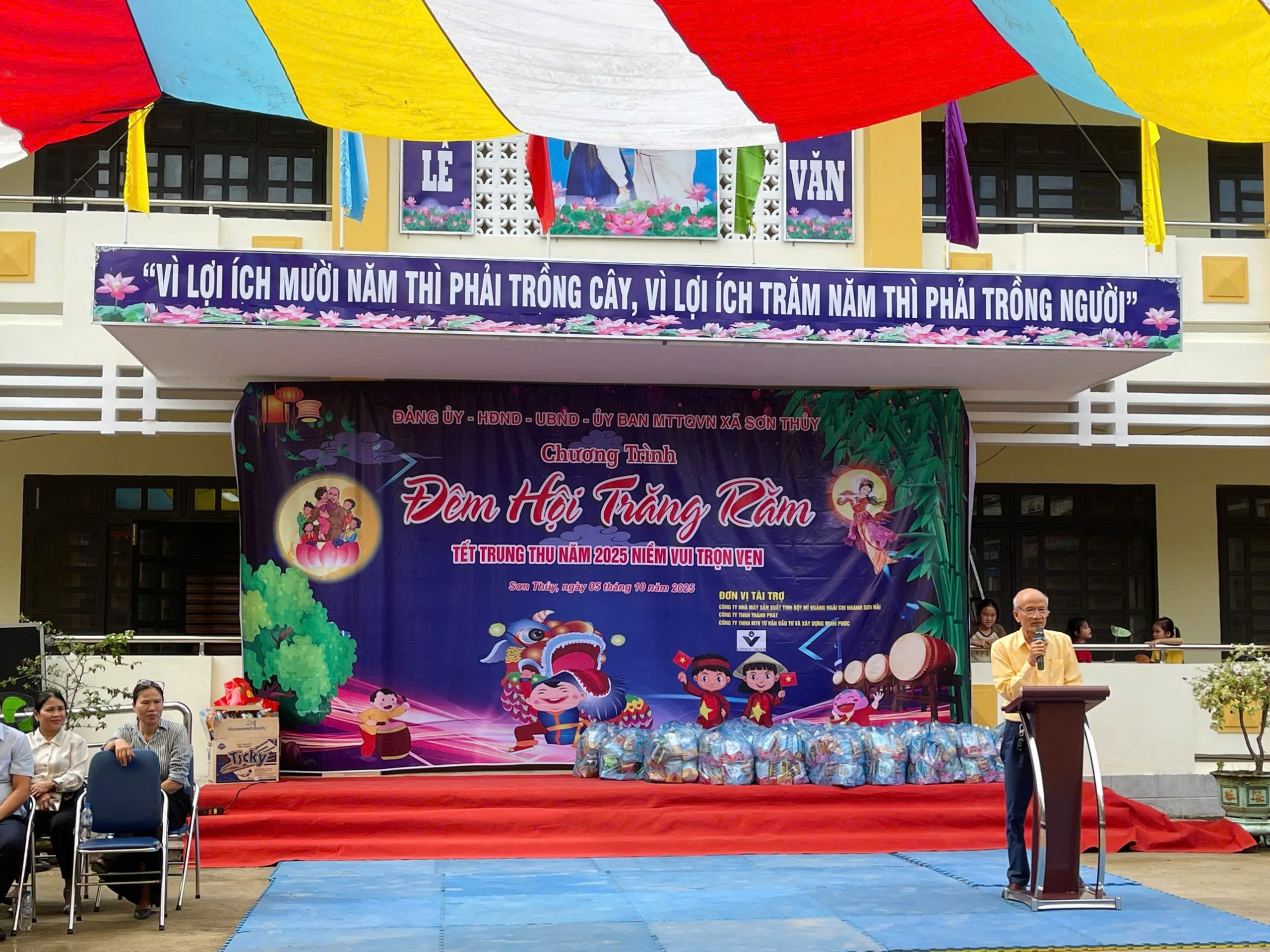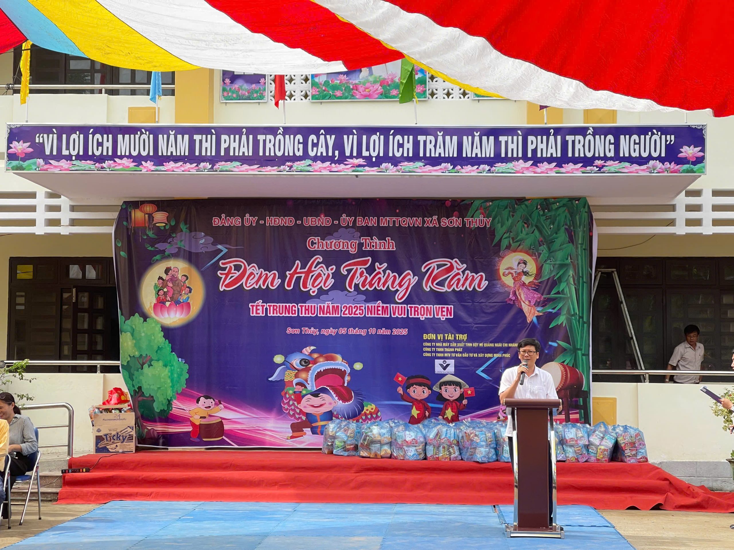 💬 Phát biểu tại chương trình, đồng chí Đoàn Văn Danh – Bí thư Đảng ủy xã Sơn Thủy gửi lời chúc mừng tới toàn thể thầy cô, phụ huynh và học sinh, chúc các em có một mùa Trung thu thật vui tươi, ấm áp. Đồng chí biểu dương tinh thần nỗ lực của nhà trường trong việc tổ chức hoạt động ý nghĩa cho thiếu nhi, đồng thời khẳng định Đảng ủy và chính quyền địa phương sẽ luôn quan tâm, tạo điều kiện để các em học tập, rèn luyện và phát triển toàn diện. 🎁