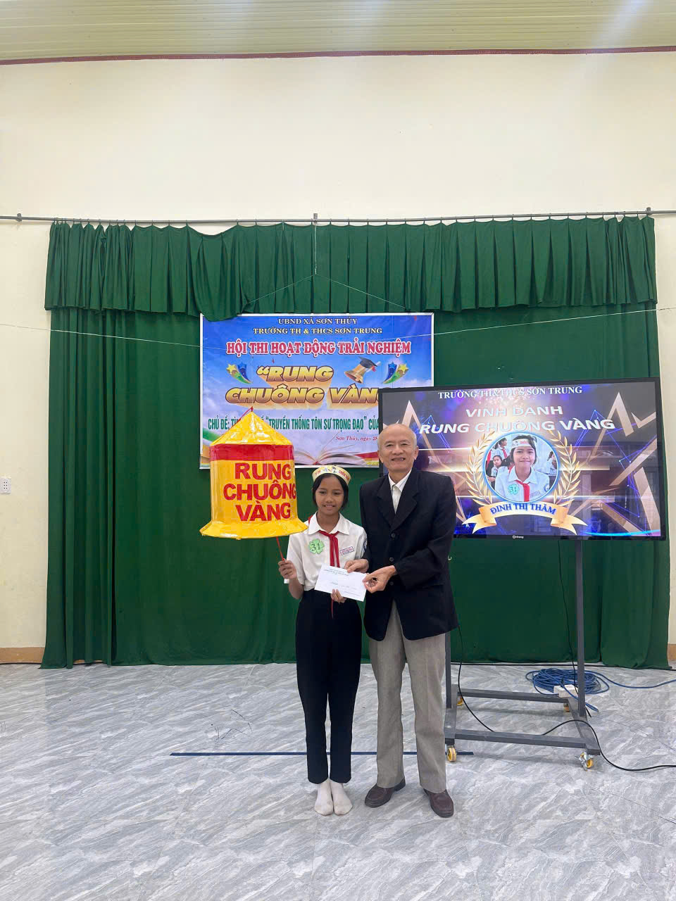 Trải qua 34 câu hỏi, em Đinh Thị Thăm – học sinh lớp 7 đã xuất sắc trụ vững đến cuối cùng, vượt qua nhiều thí sinh tài năng khác và vinh dự Rung được Chuông vàng – biểu tượng của trí tuệ và sự kiên trì.